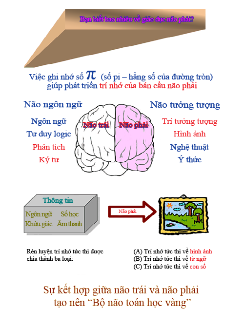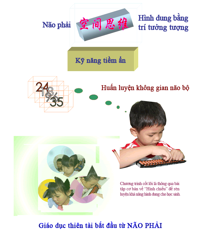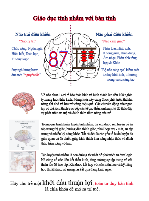 Kỹ Năng Ghi Nhớ — Bộ nhớ là khả năng lưu trữ và truy xuất thông tin cũng như kinh nghiệm. Khoa học chỉ ra rằng bộ nhớ của não trái là bộ nhớ ngắn hạn, trong khi đó một hình ảnh được ghi lại trong não phải sẽ ở lại trong tâm trí mãi mãi. Bằng cách kích thích não phải với số học tinh thần, và kết hợp với nhanh nhạy của mắt, tai và tay, khả năng lưu trữ và gợi nhớ đều được phát triển. Do đó, khả năng giải quyết các câu hỏi tính toán 10 chữ số chỉ trong vài giây chỉ là một thành công nhỏ so với sự phát triển não bộ mà học sinh đạt được trong quá trình đào tạo.